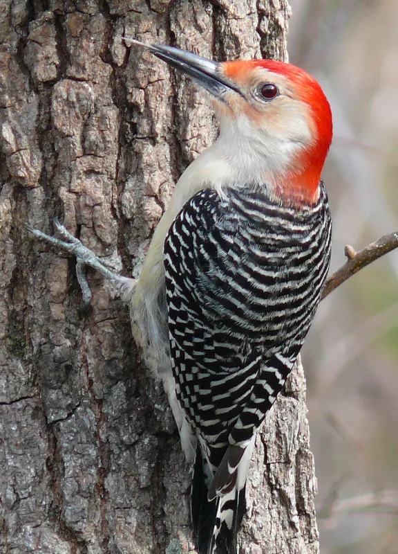 Suet cages, tree trunks, and backyard feeders.